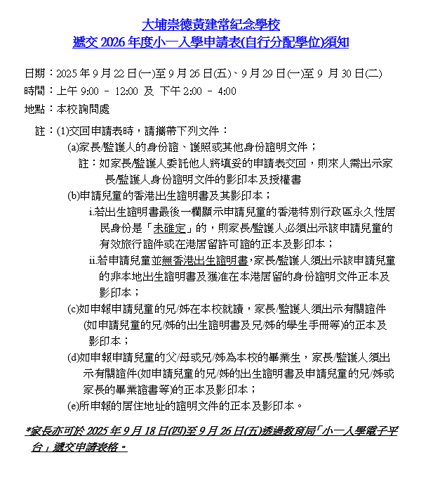 遞交2026年度小一入學申請表(自行分配學位)須知